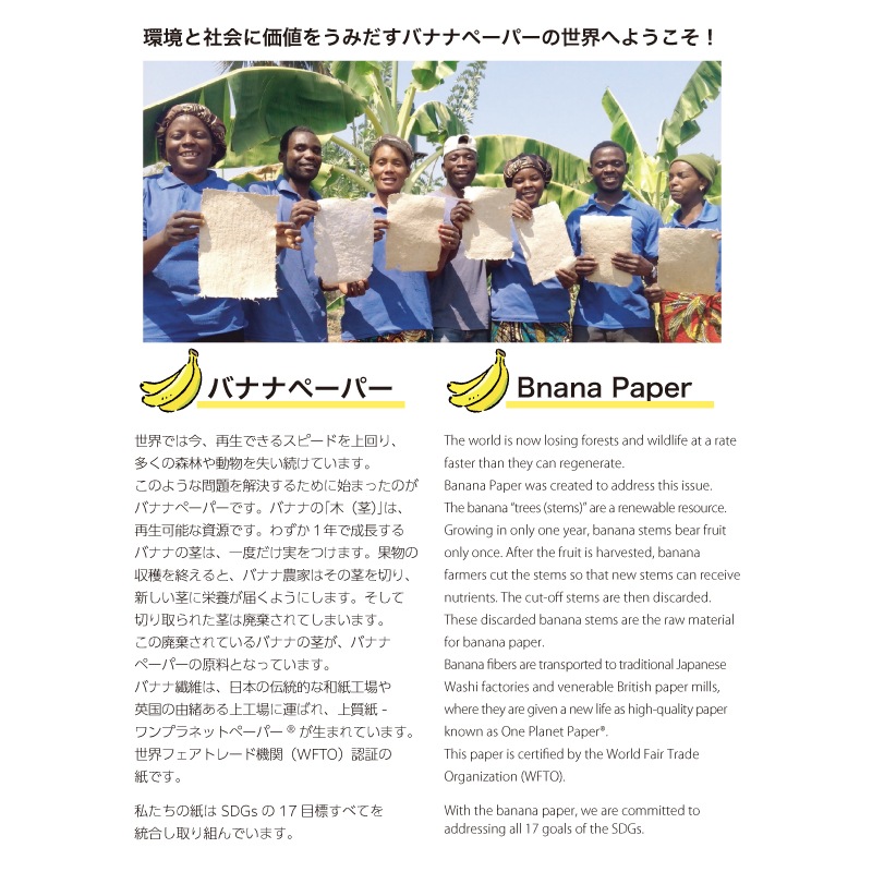 バナナペーパーは、廃棄されてしまうバナナの茎を原料としており、日本の伝統的な和紙工場や英国の由緒ある上工場に運び、バナナ繊維配合の紙(ワンプラネットペーパー)を作っています。また、世界フェアトレード機関(WFTO)認証の紙でもあり、SDGsの17目標すべてに対して取り組めます。