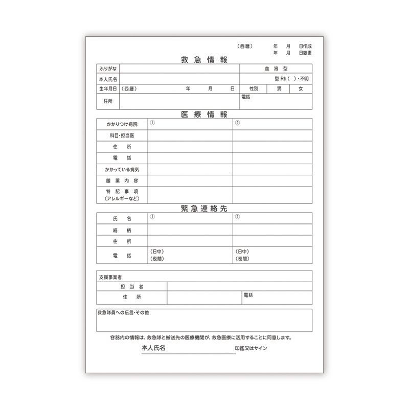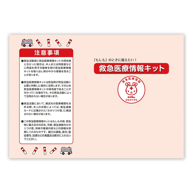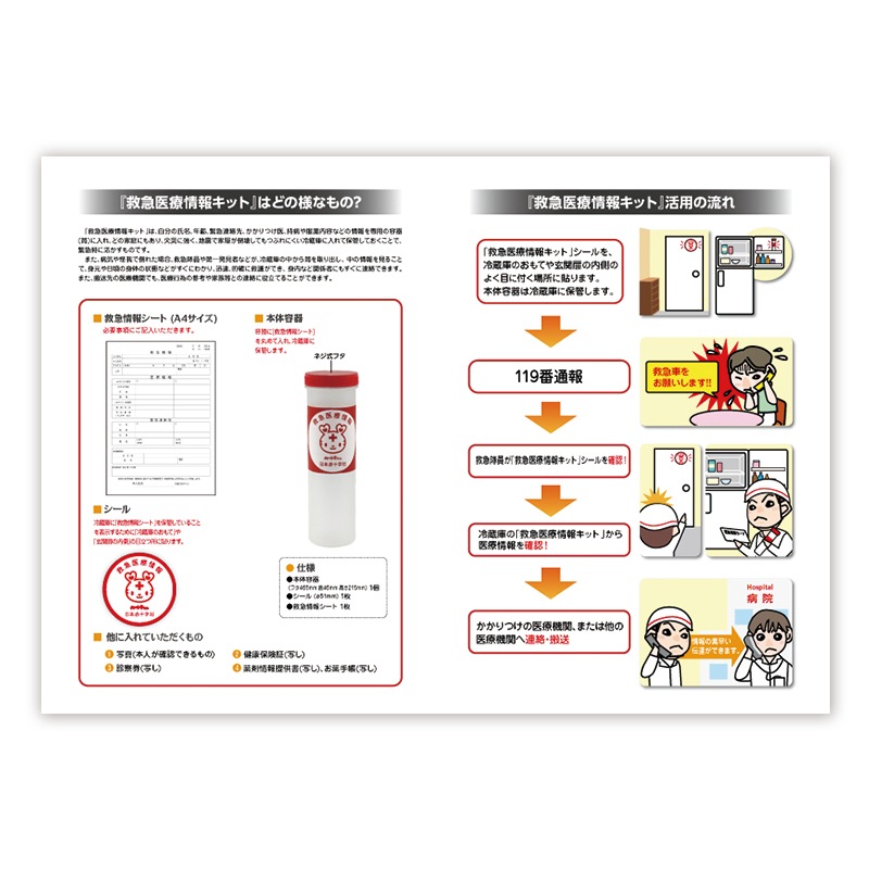 付属の情報シートに「氏名」「生年月日」「血液型」「服薬内容」「かかりつけ医」「緊急連絡先」などを記録し、ご自宅の冷蔵庫に保管することで、救急隊等による迅速な救急医療活動に活かすことができます。